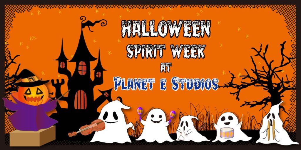Get ready to embrace the Halloween spirit at Planet e Studios! We’re hosting a spooky-fun Spirit Week from Monday, October 27th through Thursday, October 30th, and we want you to be part of the fun! During this festive time, students and teachers are encouraged to dress up in their favorite Halloween costumes each day, bringing an extra touch of magic and creativity to your music lessons. Whether you’re feeling ghoulish, enchanting, or just plain silly, we can’t wait to see your imaginative outfits and celebrate the season together. Get ready to rock out in your Halloween best! 🎃👻🎵